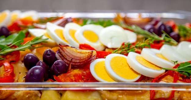 Use também 5 batatas fatiadas e pré-cozidas, 1 cebola média fatiada e 5 dentes de alho para criar uma base saborosa. Acrescente 4 ovos cozidos, 2 tomates fatiados e uma variedade de azeitonas verdes e roxas a gosto, para adicionar textura e cor.