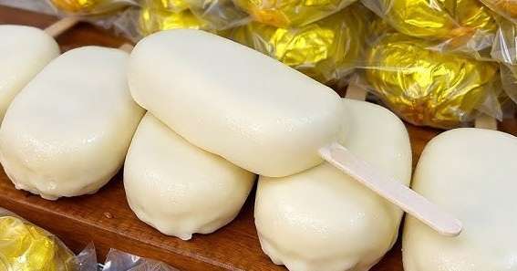 O toque final é dado com um banho de cobertura de chocolate branco. Derretido previamente no micro-ondas e combinado com óleo de coco, o chocolate forma uma casca crocante ao redor do picolé assim que é mergulhado e retirado rapidamente. O resultado é uma sobremesa refrescante e esteticamente atraente, perfeita para qualquer ocasião.