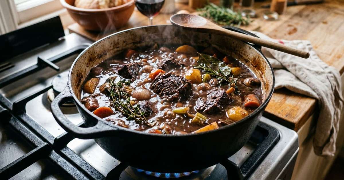 Durante o cozimento, o álcool do vinho evapora, deixando para trás compostos aromáticos e açúcares naturais. Esses elementos caramelizam e enriquecem o caldo, conferindo uma cor intensa e uma textura aveludada ao prato. O resultado é um ensopado com um sabor profundo e sofisticado, que parece ter sido cuidadosamente preparado ao longo de muitas horas.