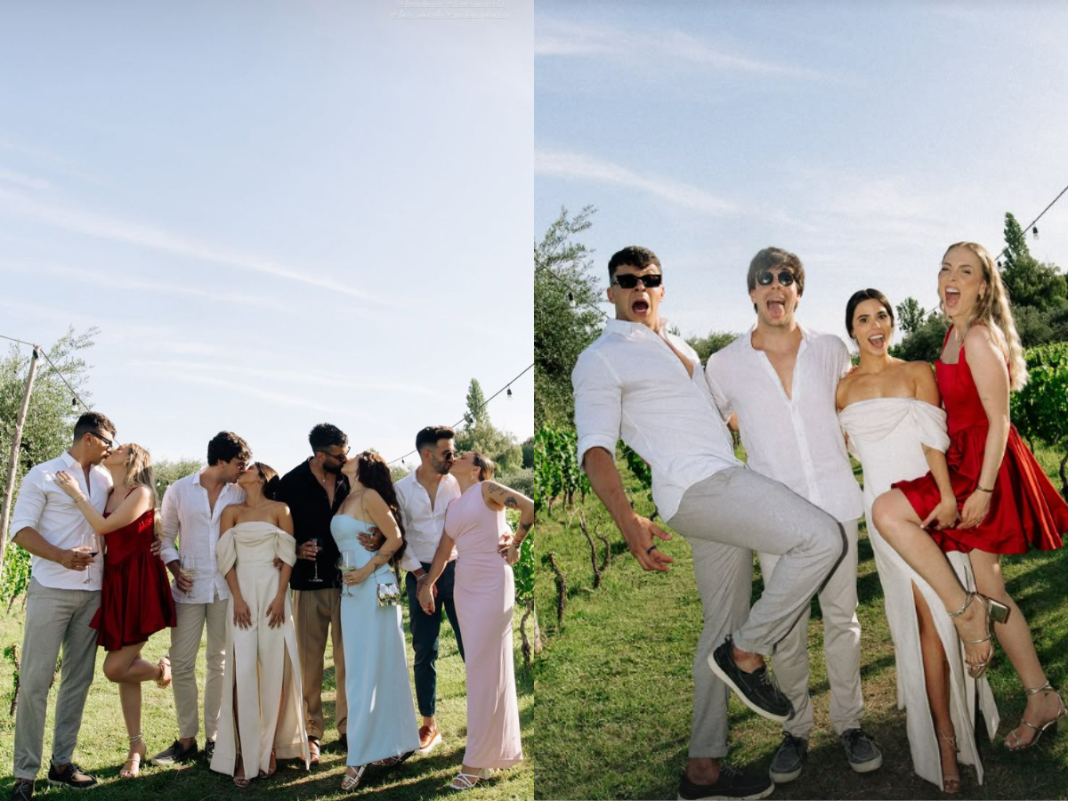 Em uma das fotos compartilhadas, o casal aparece trocando um beijo em um vinhedo, ao lado de outros casais que também posaram de forma semelhante. Outro registro mostra Tata e Júlio ao lado dos noivos em um momento descontraído.