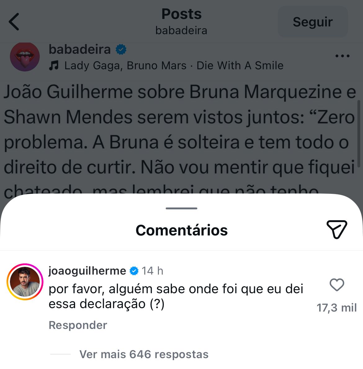 Diante da repercussão, João Guilherme utilizou a seção de comentários da publicação para negar veementemente a autoria da declaração. Em tom de ironia, questionou onde e quando teria concedido tal entrevista, afastando os rumores de qualquer incômodo com a relação entre Marquezine e Mendes.